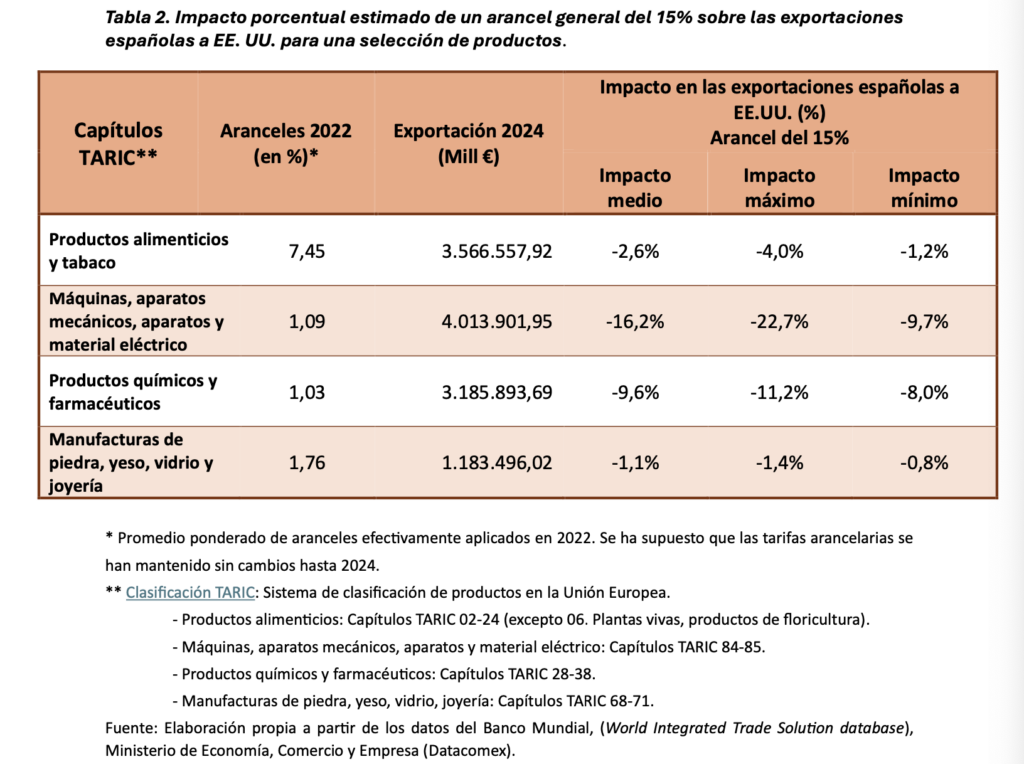 En concreto, la entrada en vigor de un arancel del 15% generalizado a las importaciones estadounidenses procedentes de la UE podría provocar una caída del 10,1% en las exportaciones españolas a ese país. En términos monetarios esto supondría una reducción de 1.841 millones de euros sobre el total de exportaciones españolas a EE.UU. del año 2024.