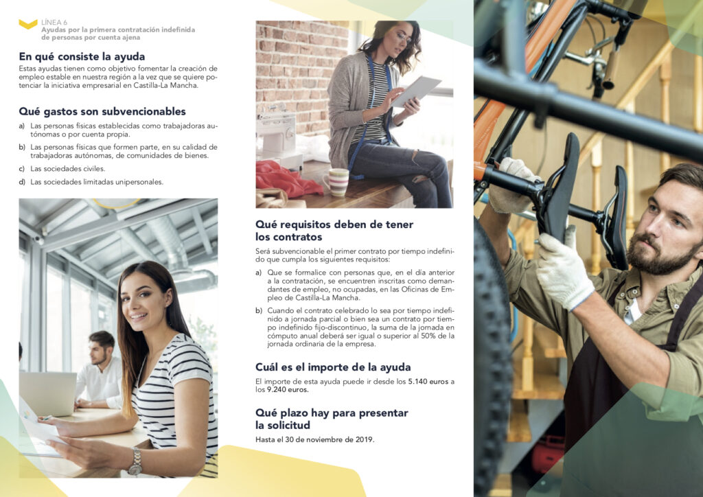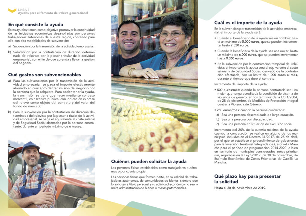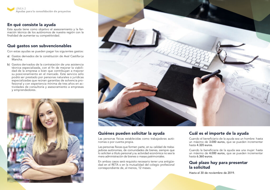 Con el objetivo de fomentar la creación de empleo estable y de potenciar la iniciativa empresarial en la región, nacen 6 líneas de ayudas para autónomos de Castilla-La Mancha. La solicitud de las mismas finaliza el 30 de noviembre de 2019 y pasan desde ayudas para la conciliación hasta las de consolidación de proyectos o relevo generacional, entre otras. Estas son todas las líneas: